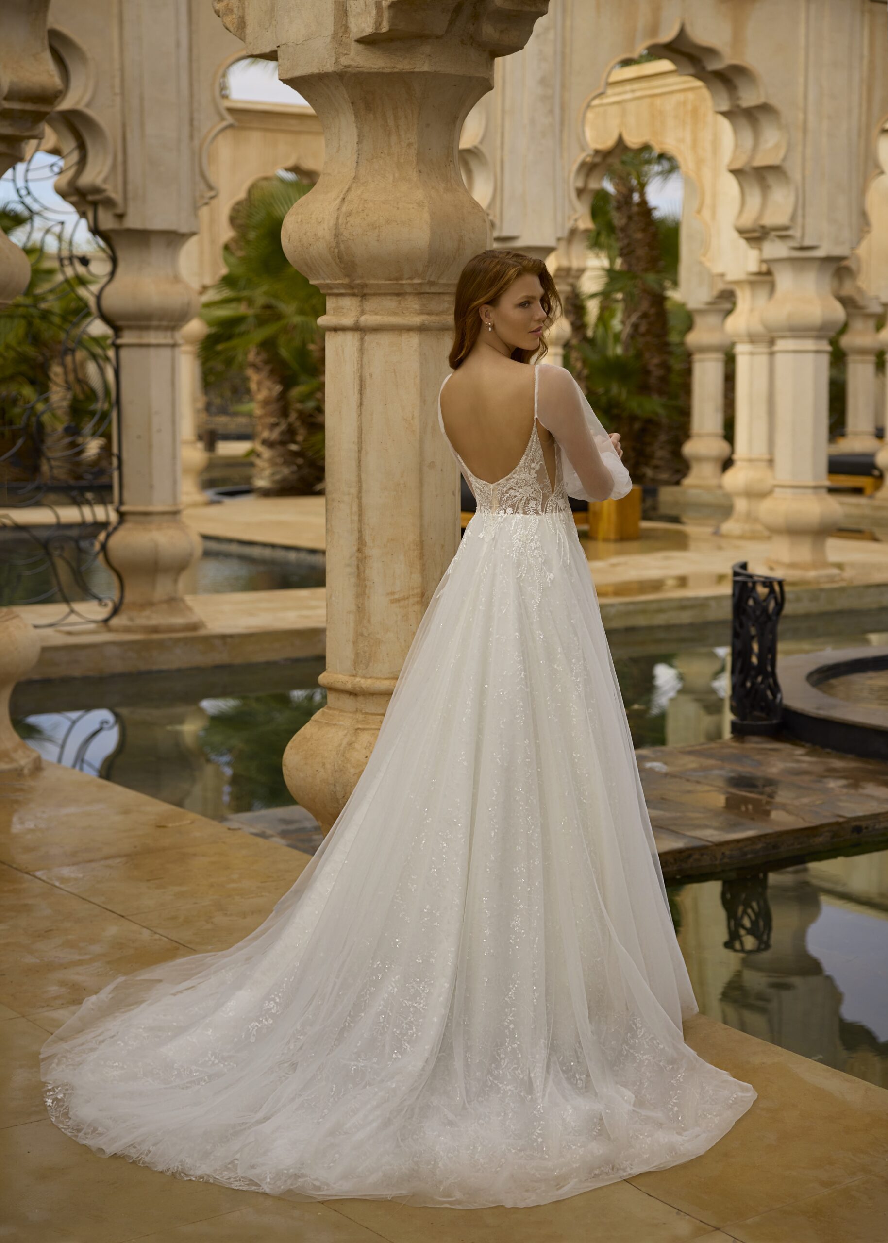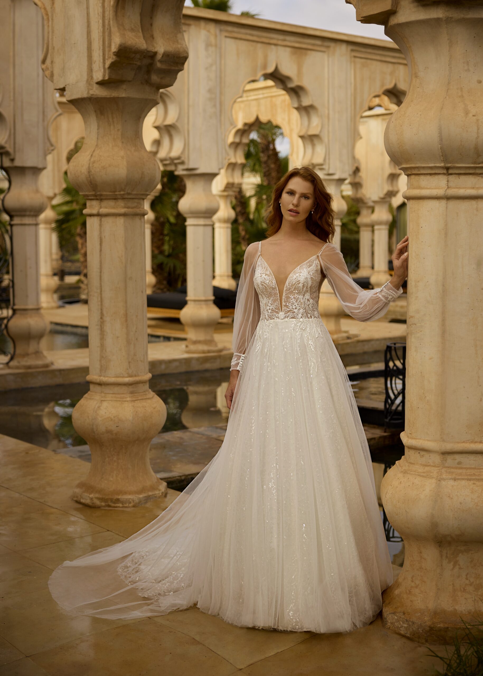 Das Carina-Kleid besteht aus durchsichtiger Spitze, die über einen glitzernden Tüllrock fällt, und besticht vor allem durch seine unglaublichen Ärmel.