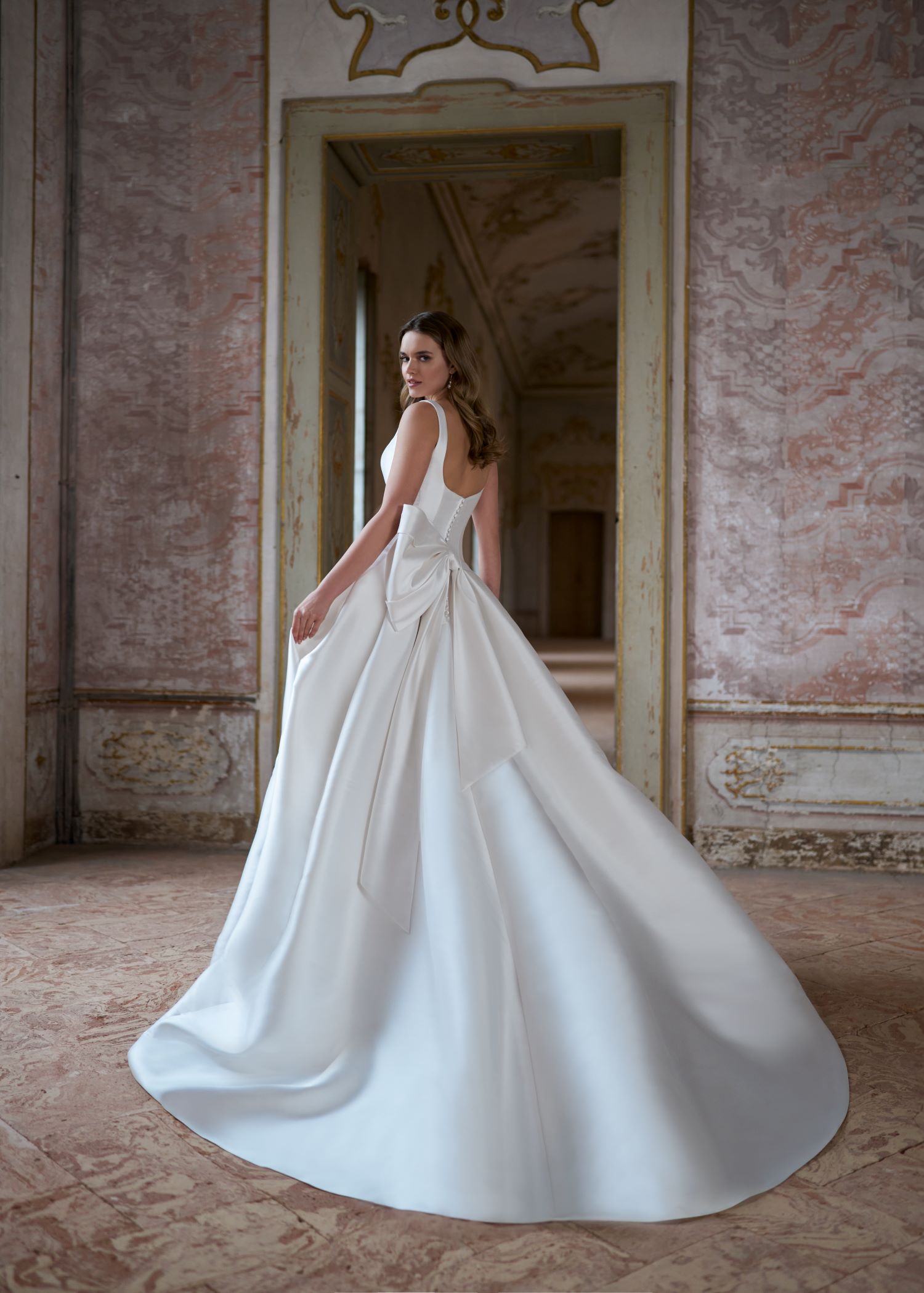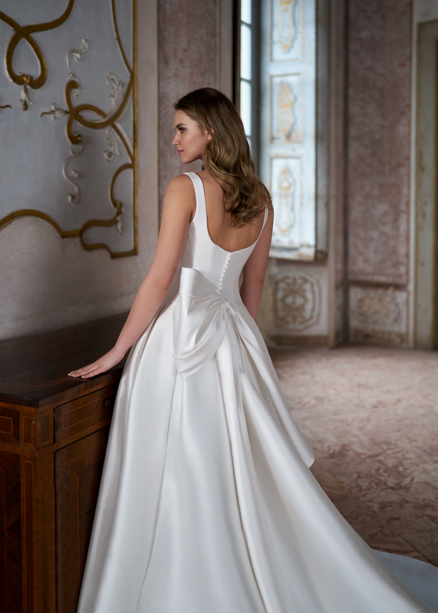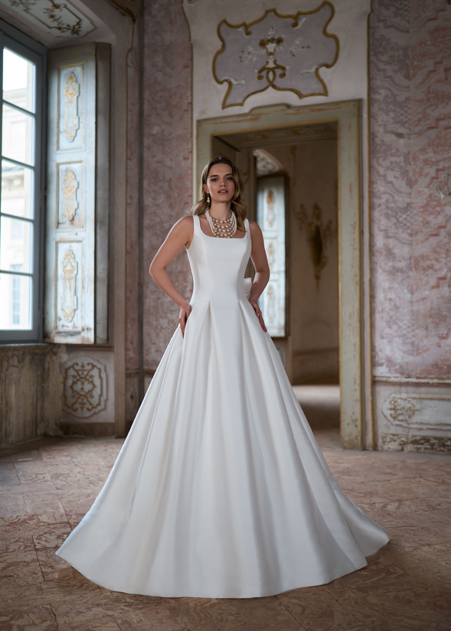 A wedding dress with a feminine touch: effortlessly chic and simple! This mikado ballgown brings a clean, minimalist aesthetic with a square neckline and a beautifully understated silhouette. The bow at the back adds just the right amount of romantic detail, making this gown a perfect choice for brides who want to shine bright on their wedding day without the extra embellishments.